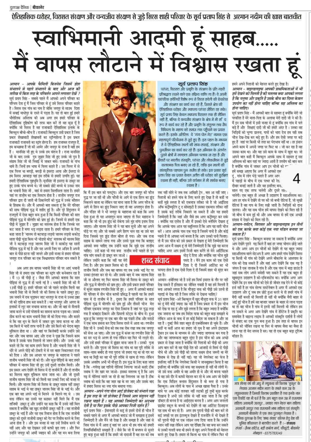 ऐतिहासिक धरोहर, विरासत संरक्षण और वन्यजीव संरक्षण से जुड़े सिरस शाही परिवार के सूर्य प्रताप सिंह से दैनिक युगपक्ष के कॉलम शब्द संवाद हेतु अरमान नदीम की खास बातचीत ।